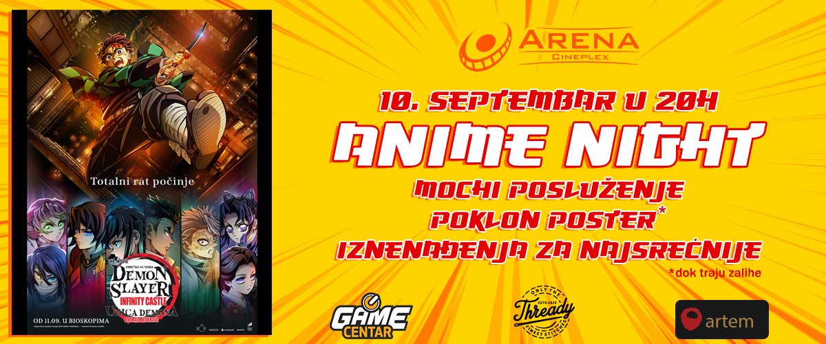 Da li ste spremni za legendarnu bitku?! Anime night uz poklone i slatku mochi degustaciju 10. septembra od 20 časova u Areni okuplja najveće obožavatelje japanske mange u dugoočekivanoj filmskoj adaptaciji “Ubica demona: Dvorac beskraja”. Ulaznice su u prodaji!